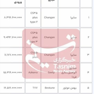 تبصره: قیمت مندرج در جدول شماره ۱، قیمت قطعی در مبادی ورودی بوده و هزینهها و عوارض قانونی بعد از ترخیص از قبیل: بیمه شخص ثالث، مالیات بر قیمت افزوده، هزینههای شماره گذاری، اسقاط خودروی فرسوده، کرایه حمل و … به قیمتهای فوق اضافه میگردد که واردکنندگان با مراعات آیین نامه اجرایی قانون حمایتاز مصرف کنندگان ماشین می توانند نسبت به دریافت آن عمل نموده و در موعد مقرر نسبت به تحویل ماشین عمل نمایند.