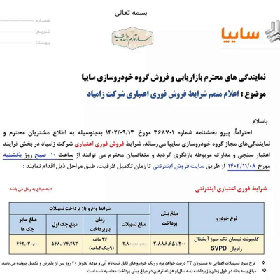 به نقل از تجارتنیوز، بر این مبنا، به خبر مشتریان محترم و نمایندگیهای مجاز گروه خودروسازی سایپا میرساند، شرایط فروش سریع اعتباری شرکت زامیاد در قسمت فرآیند اعتبار سنجی و مدارک وابسته بازنگری گردید و متقاضیان محترم میتوانند از ساعت ۱۰ صبح روز یکشنبه مورخ ۱۴۰۲/۱۱/۰۸ از طریق سایت فروش اینترنتی تا زمان تکمیل ظرفیت، مطابق مرحله های ذیل عمل نمایند.