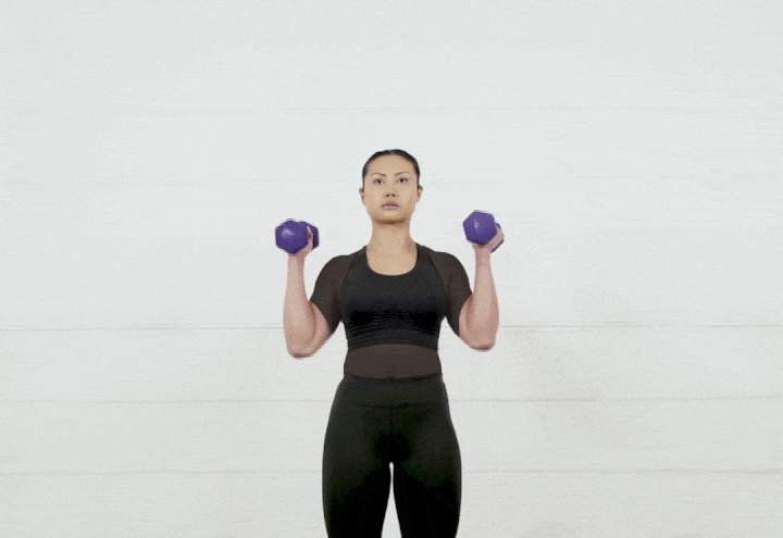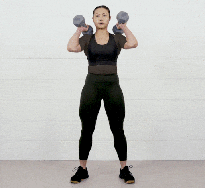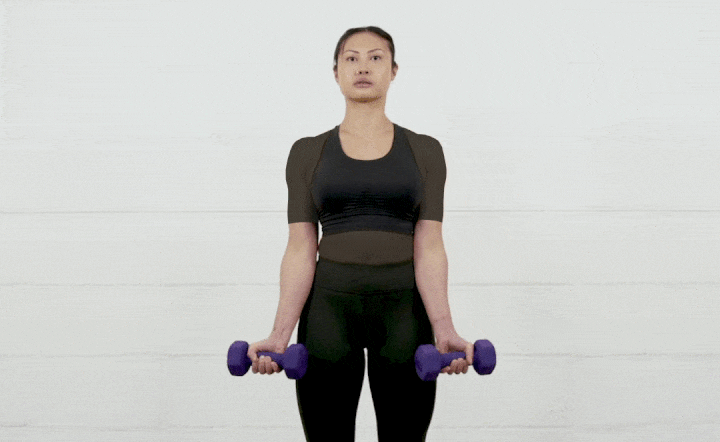 پاها را مقداری زیاد تر از عرض شانه باز کنید و در هر دست دمبلی را نگه دارید. دمبلها را تا سطح شانه بالا بیاورید و نزدیک بدن نگه دارید. مقداری مکث کنید و سپس بهآرامی دمبلها را پایین بیاورید. فراموش نکنید که آرنجها را بالاتر از بازوها نگه دارید.