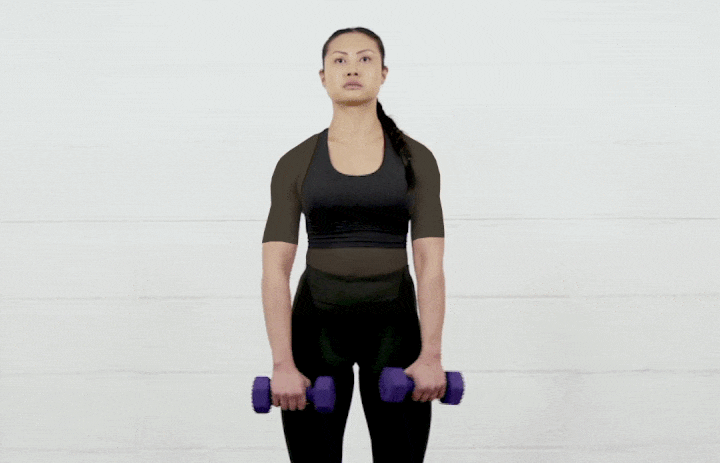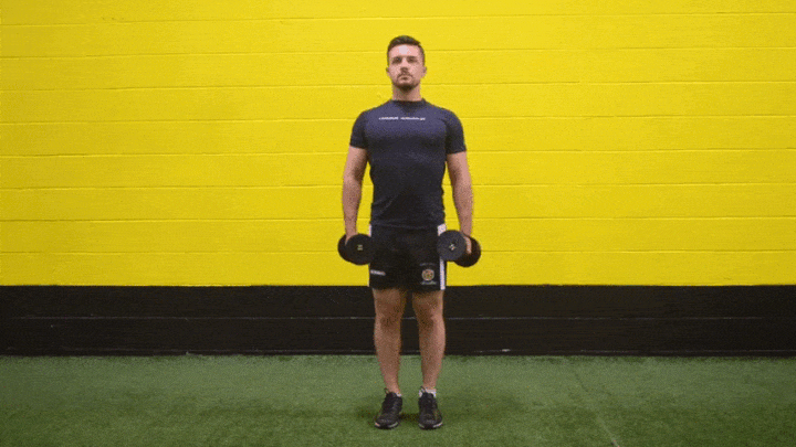 برای انجام این حرکت در حالی که در هر دست دمبلی دارید بایستید. پاها و بازوها بهاندازه عرض شانه باز و زانوها مقداری خمیده باشند. بیشتر از ۴۵ درجه خم نشوید و عضلات مرکزی را منقبض کنید. با انجام بازدم، دمبلها را در خطی مستقیم بالا بیاورید. مچ دستها منقبض باشند و پاها را حرکت ندهید. هنگامی دمبلها را بلند میکنید، بازوها نباید از سطح شانه بالاتر بروند. در بالای حرکت باید حس کنید که استخوانهای کتف به هم نزدیک خواهد شد. دمبلها را تا حالت ابتدایی پایین بیاورید و مرحله های بالا را تکرار کنید. پیش از همهکردن یک سِت، حالت بدن خود را تحول ندهید.
