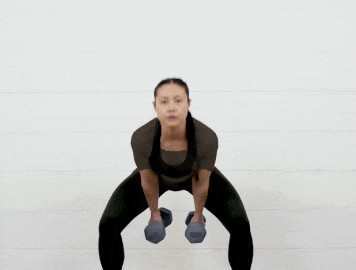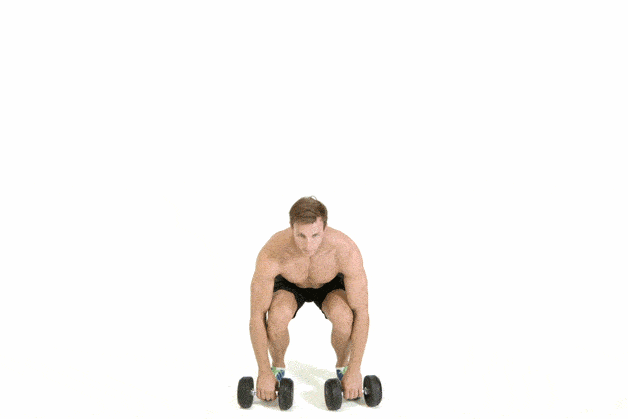 پاها را بهاندازه عرض باسن باز کنید و دو دمبل را در جلوی خود نگه دارید. بدون خمکردن پایین کمر، زانوها را مقداری خم کنید، باسن را عقب ببرید و دمبلها را بین پاها تاب بدهید. هنگامی دمبل پشت شما است، عضلات سرینی را منقبض کنید و باسن را به جلو پرتاب کنید و دمبل را تا سطح سینه بالا بیاورید.