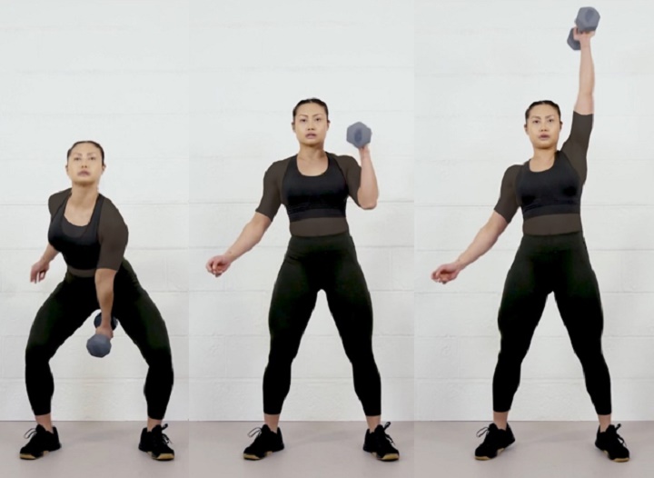 با یک دست دمبلی را نگه دارید و بهصورت اسکوات بنشینید. تا جایی پایین بروید که باسن مقداری پایینتر از زانوها قرار بگیرد. با منقبضکردن باسن به حالت اولیه برگردید و دمبل را با حرکتی همانند پرس سرشانه بهسمت سقف ببرید. دمبل را تا حالت اولیه پایین بیاورید و مجدد همین مرحله های را تکرار کنید.