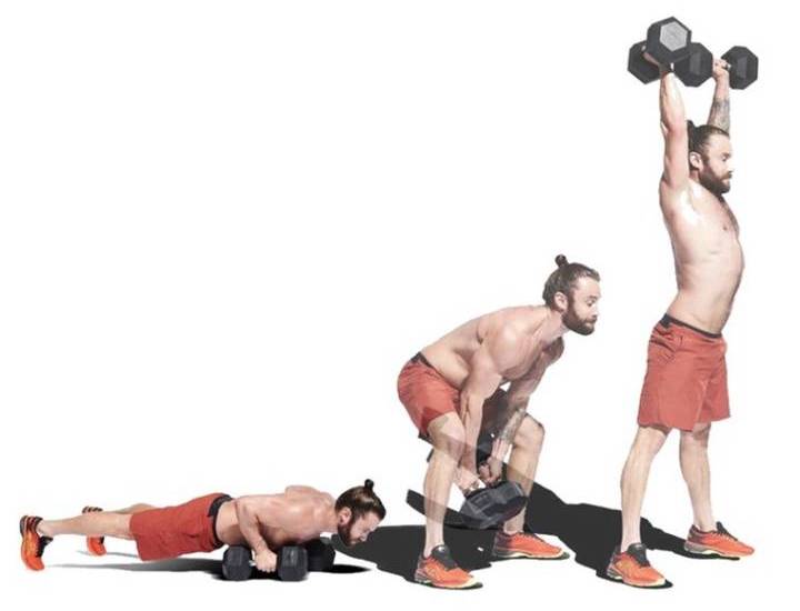 دو دمبل را روی زمین جلوی پاها قرار دهید. با گرفتن دمبلها به حالت پلانک دربیایید. سپس با هر دو پا بهسمت دمبلها بپرید؛ طوری که دمبلها بین پاهایتان قرار بگیرند. با تکیه بر عضلات سرینی، دمبلها را بالای سر ببرید. سپس با دقت آنها را پایین بیاورید و با پاها به عقب بپرید و مجدد در حالت پلانک قرار بگیرید.