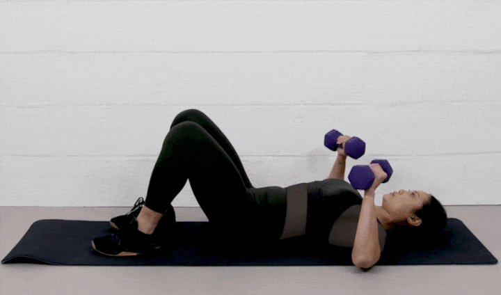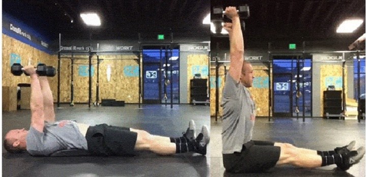 بهپشت دراز بکشید، پاها را صاف روی زمین قرار دهید و دو دمبل را بالای سینه نگه دارید. بهسمت بالا حرکت کنید و دمبلها را بهسمت سقف بالا ببرید. سپس بدن را پایین بیاورید و در حالت اولیه قرار بگیرید. با زانوهای خمیده و یک دمبل نیز میتوانید این حرکت را انجام دهید. دمبل را با دو دست بالای سینه بگیرید و از فردی بخواهید که پاهایتان را نگه دارد. این کار جهت میشود در تلاش برای پایین نگهداشتن پاها به گردنتان سختی نیاورید. تنه را از زمین بلند کنید و بهسمت زانوها حرکت کنید، سپس بهآرامی بدن را پایین بیاورید.
