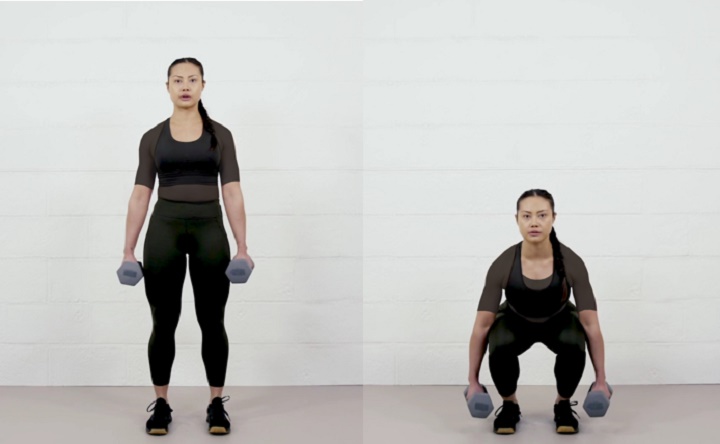 پاها بهاندازه عرض شانه باز باشند و در هر دست دمبلی را نگه دارید. باسن را عقب برانید، تا حالت اسکوات پایین بیایید؛ طوری که رانها با زمین موازی شوند و باسن مقداری پایینتر از زانوها قرار بگیرد. شانهها را عقب نگه دارید و دستها ثابت در دو طرف بدن باشند. در آخر، با منفعت گیری از پاشنهها و ماهیچههای سرینی مجدد بلند شوید.