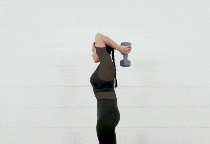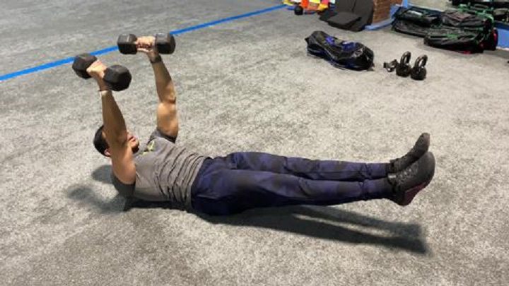 بهپشت روی زمین دراز بکشید. دو دمبل را مستقیم بالای شانهها نگه دارید. عضلات شکم را منقبض کنید و پایین کمر را به زمین سختی دهید. پاها را یک اینچ از زمین بلند کنید. استخوانهای کتف را بالاتر از سطح زمین نگه دارید. بازوها را مقداری به عقب حرکت دهید. دستها را فقط در تکه آرنج خم کنید و دمبلها را تا جایی پایین بیاورید که تقریبا شانهها را لمس کنند. بقیه تکههای بدن را در حالت ابتدایی و منقبض نگه دارید. در حالی که فقط آرنجها را صاف میکنید، مجدد دمبلها را بالا ببرید.