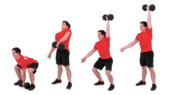 دمبل را روی زمین قرار دهید و بالای آن بایستید و پاها را اندکی زیاد تر از عرض شانه باز کنید. دمبل را با یک دست بگیرید. باسن را عقب ببرید و تا حالت اسکوات پایین بیایید. تلاش کنید سینه را بالا و کمر را صاف نگه دارید. در حالی که پاها و کمرتان را صاف میکنید، دمبل را بالا ببرید. صاف بایستید و بازو را صاف نگه دارید. بعد از بردن دمبل به بالای سر، بازو را رها کنید و پایین بیاورید، باسن را عقب بکشید و زانوها را به حالت اسکوات خم کنید. در حالت اسکوات دمبل را پایین بیاورید و روی زمین قرار دهید. همین مرحله های را با دست دیگر انجام دهید.