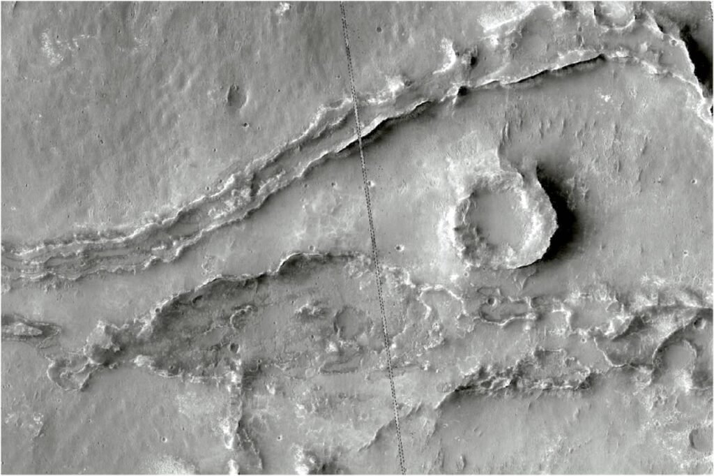در این تصاویر، تعداد بسیاری «شیار سینوسی آبی» (نوعی ویژگی زمینشناسی که به آنها کانالهای معکوس هم حرف های میشود) شناسایی شده است. این شیارها وقتی راه اندازی خواهد شد که مسیرهای رسوبی حمل شده توسط رودخانههای باستانی به مرور زمان سخت خواهد شد و سپس هنگامی زمین نرمتر اطراف آنها فرسایش اشکار میکند، آشکار خواهد شد. درحالیکه برخی از این مسیرها نسبتاً باریک می باشند، دیگران بیشتر از یک مایل عرض دارند.